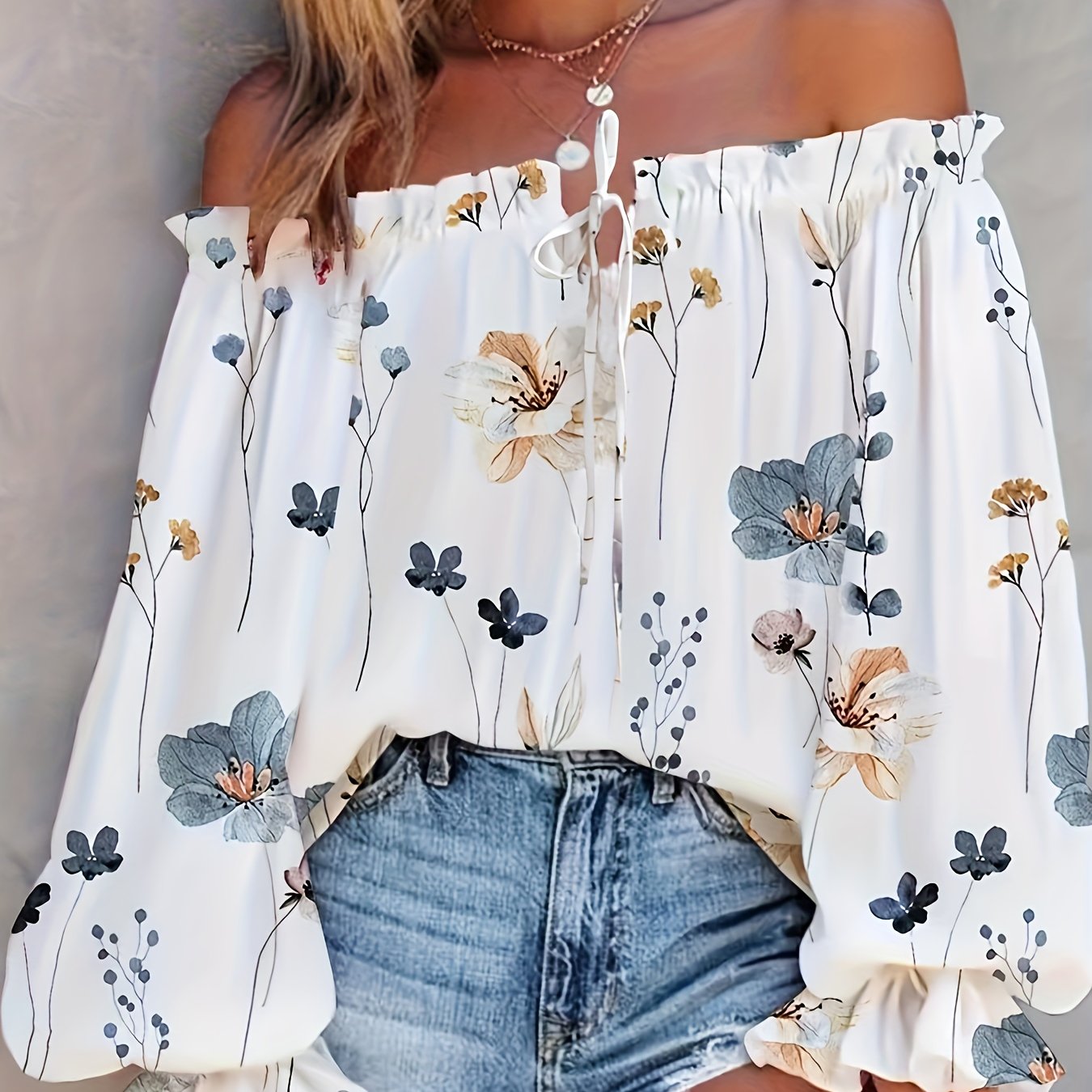 6 reviews for Off Shoulder Floral Print Tube Top, Casual Lantern Sleeve Ruffle Trim Tube Top For Spring & Summer, Women’s Clothing