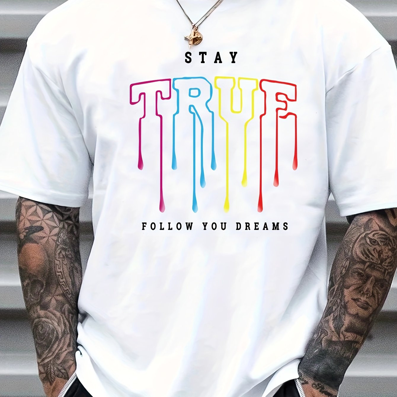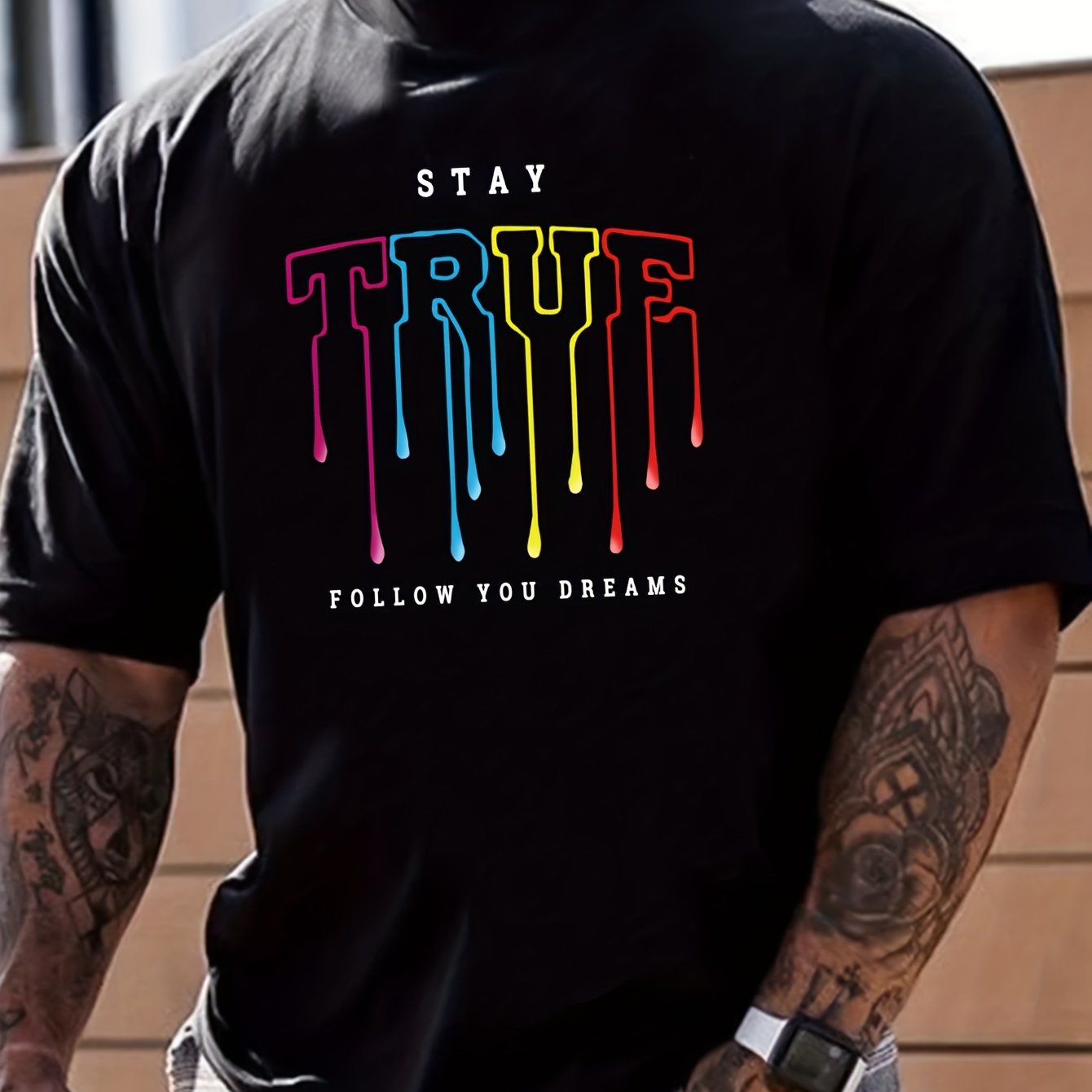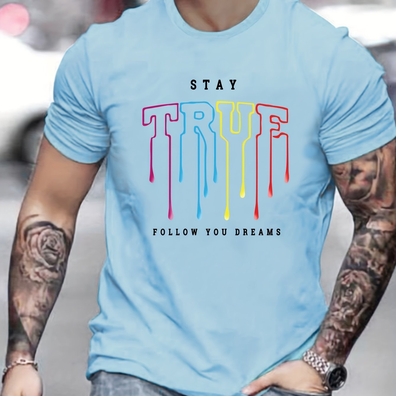 STAY TURE Print, Men’s Graphic Design Crew Neck Active T-shirt, Casual Comfy Tees Tshirts For Summer, Men’s Clothing Tops For Daily Vacation Workout Running Training