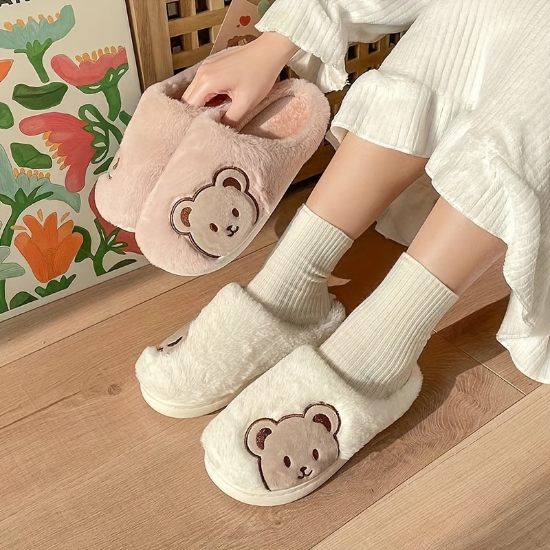 Women’s Cute Bear Pattern Slippers, Cozy Fluffy Closed Toe Warm Flat Shoes, Kawaii Bedroom Plush Slippers