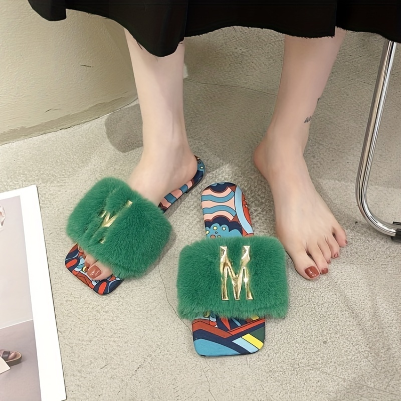 Women’s Letter & Faux Fur Decor Slide Sandals, Fashion Square Toe Flat Summer Shoes, Lightweight Slip On Shoes