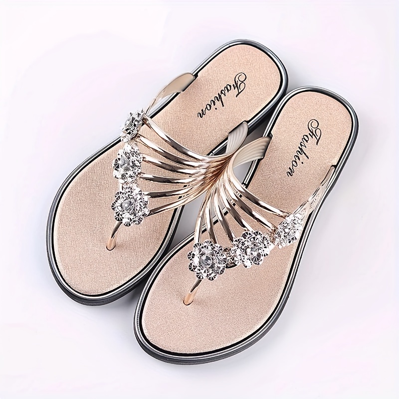 Women’s Flower Rhinestone Flip Flops, Fashion Summer Flat Slide Shoes, Outdoor Beach Slides